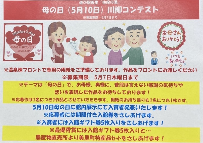 そこで今年も道の駅美里「佐俣の湯」では、『母の日川柳コンテスト』の作品を募集しております。