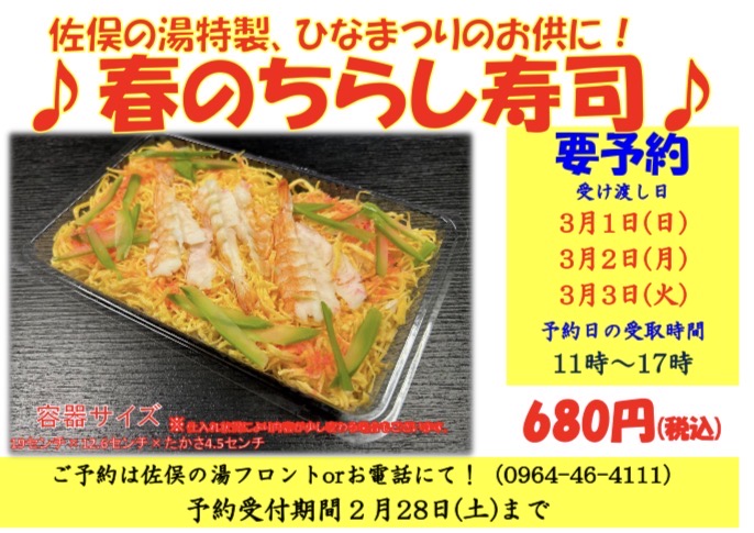 道の駅 美里「佐俣の湯」では、佐俣の湯 特製『春のちらし寿司』の予約販売を行います。