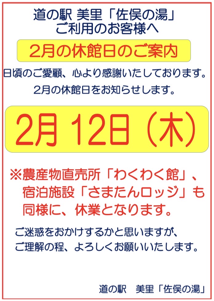 2月の休館日とイベント・営業時間についてお知らせいたします。