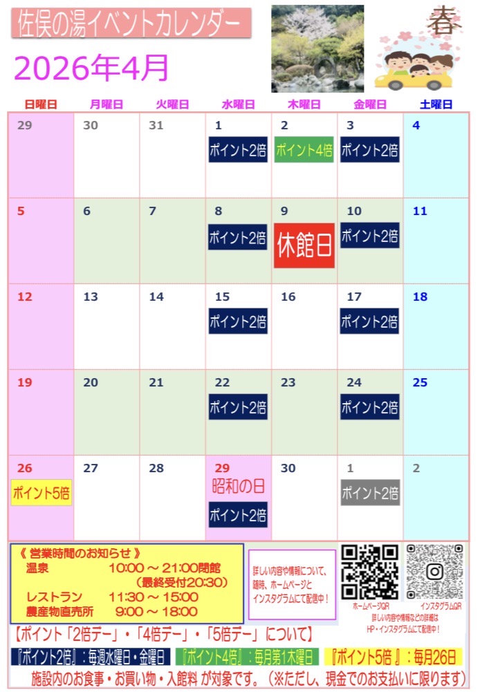 <佐俣の湯4月の行事カレンダー>のお知らせ